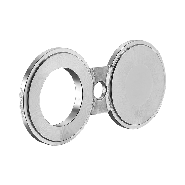 A pair of flanges shaped like spectacles (one open, one closed). Used in pipelines where flow needs to be periodically stopped.